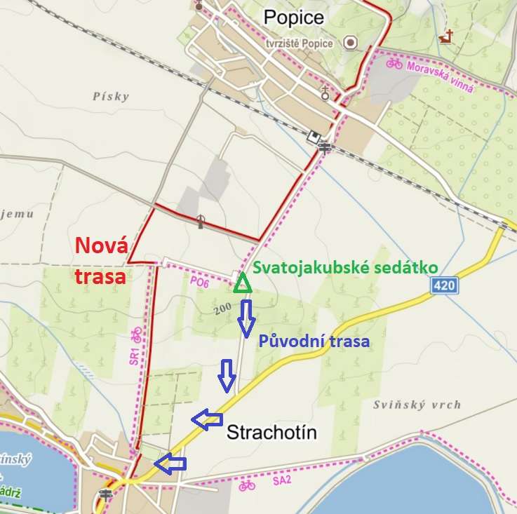 Po letech našich snah o přesunutí části Svatojakubské poutní trasy z nebezpečné silnice u Strachotína se můžeme konečně radovat. Klub českých turistů změnil podle našeho posledního, dva roky starého kompromisního návrhu, trasu dálkové červené značky (Brno, Soutok Svitavy a Svratky – Mikulov st. hranice), z původního asi 600m úseku po silnici II. třídy č. 420 mimo toto území západněji.