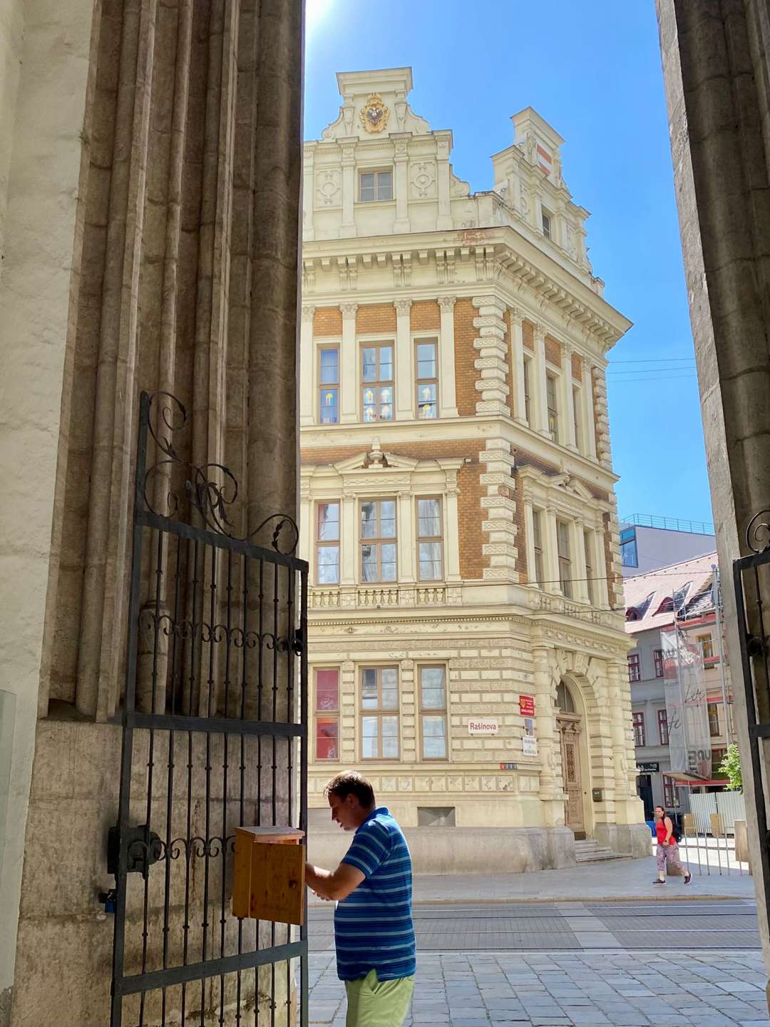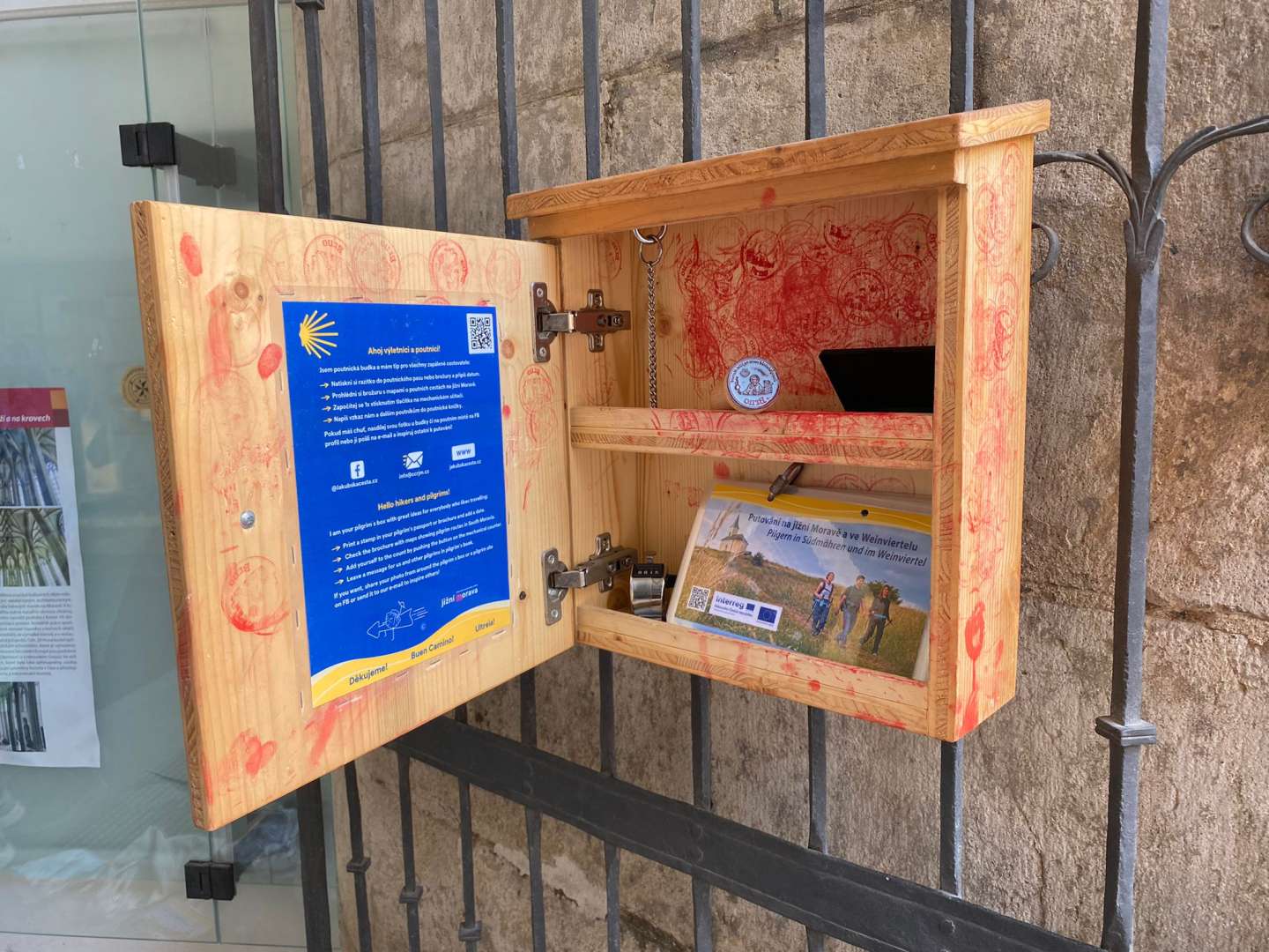 Poutnická schránka (pilgrim point) instalována na vchodových mřížích kostela Sv. Jakuba na Jakubském náměstí je opět připravená na nápor poutníků. Uvnitř najdete nové razítko s razítkovací poduškou a brožury s mapkami jihomoravských a dolnorakouských tras.